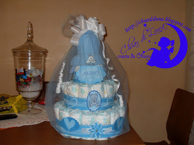 Ieri ho trovato un ottimo modo per staccare la spina e rilassarmi un po'... mi sono messa nel mio "laboratorio creativo" a pasticciare con tutti i miei arnesi magici... ed ecco qui il regalo che la mia cuginetta acquisita porterà ad un battesimo questa domenica...... da notare il berrettino di winnie che terrà al calduccio la testolina di Marco...